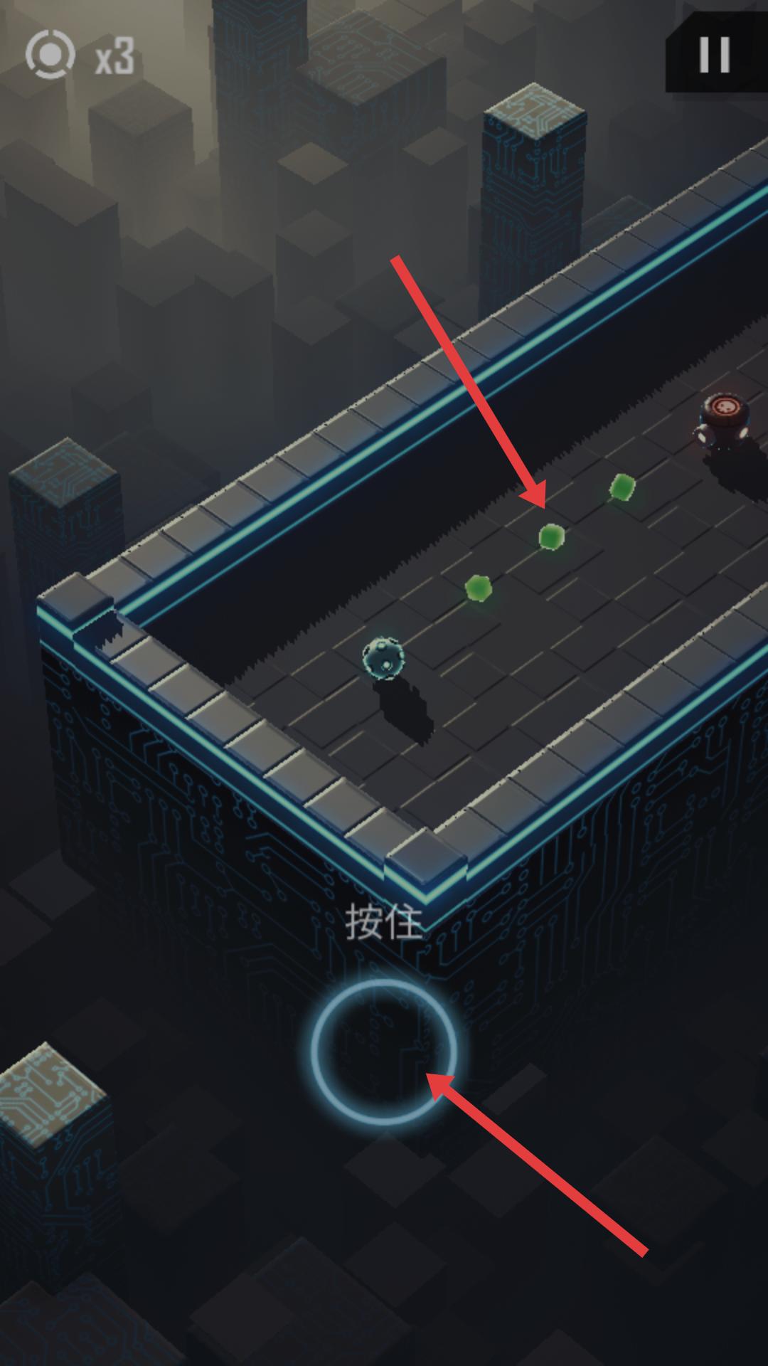 3、駭入關卡中,界面提示按住,按住屏幕,操控角色移動,收集綠色球體,同時注意躲避障礙,積累游戲分數。