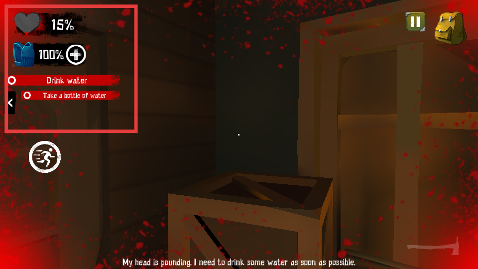2、游戲中要關注生命值和飲水狀態,首次進入角色會處在殘血狀態,當出現Drink water和ake a bottle of water提示時,說明需要補水要及時行動。