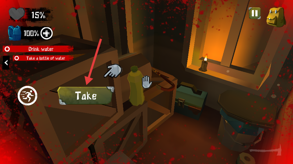 3、玩家要四處搜羅水資源,看到有水瓶等可收集物品時,點擊Take按鈕就能將水瓶收集到背包中,為后續飲水做準備。