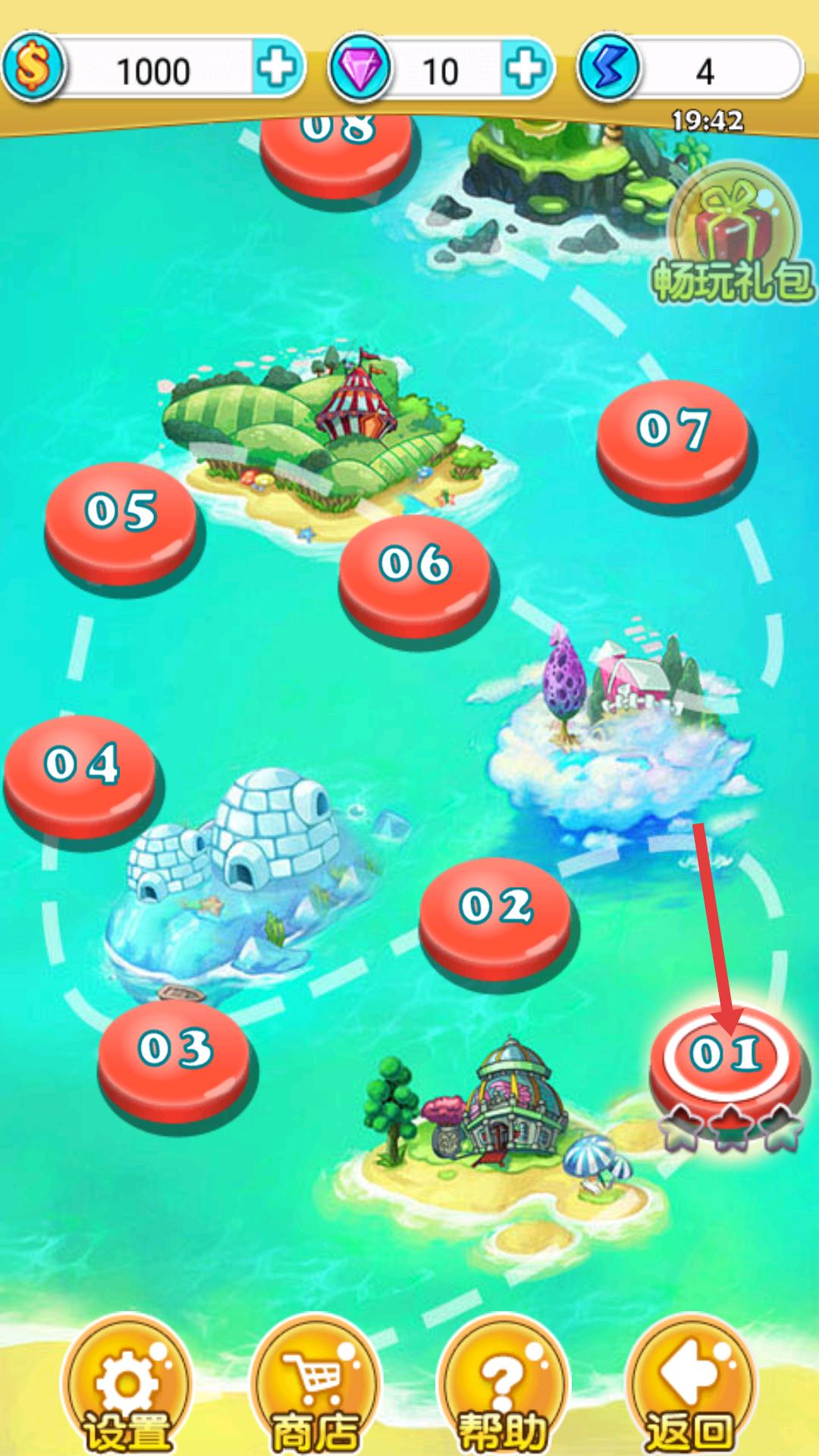 1、游戲主界面有多個帶數字的關卡按鈕,點擊標有01的按鈕,可進入第一關,開啟游戲挑戰,探索關卡內容。