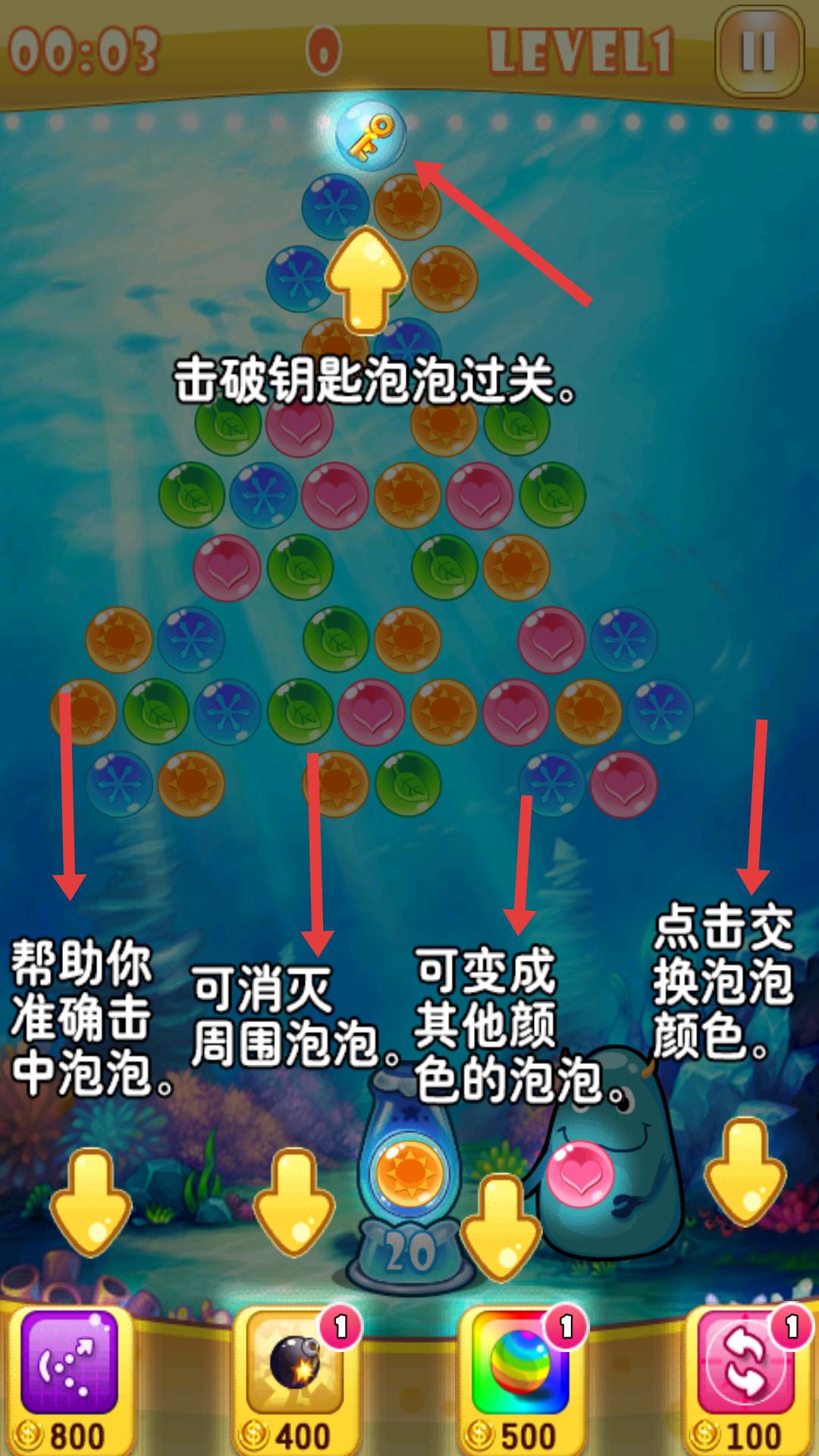 3、玩家需擊破鑰匙泡泡來過關,可利用道具,有的道具幫助準確擊中泡泡,有的能消滅周圍泡泡,還有的可變換泡泡顏色。