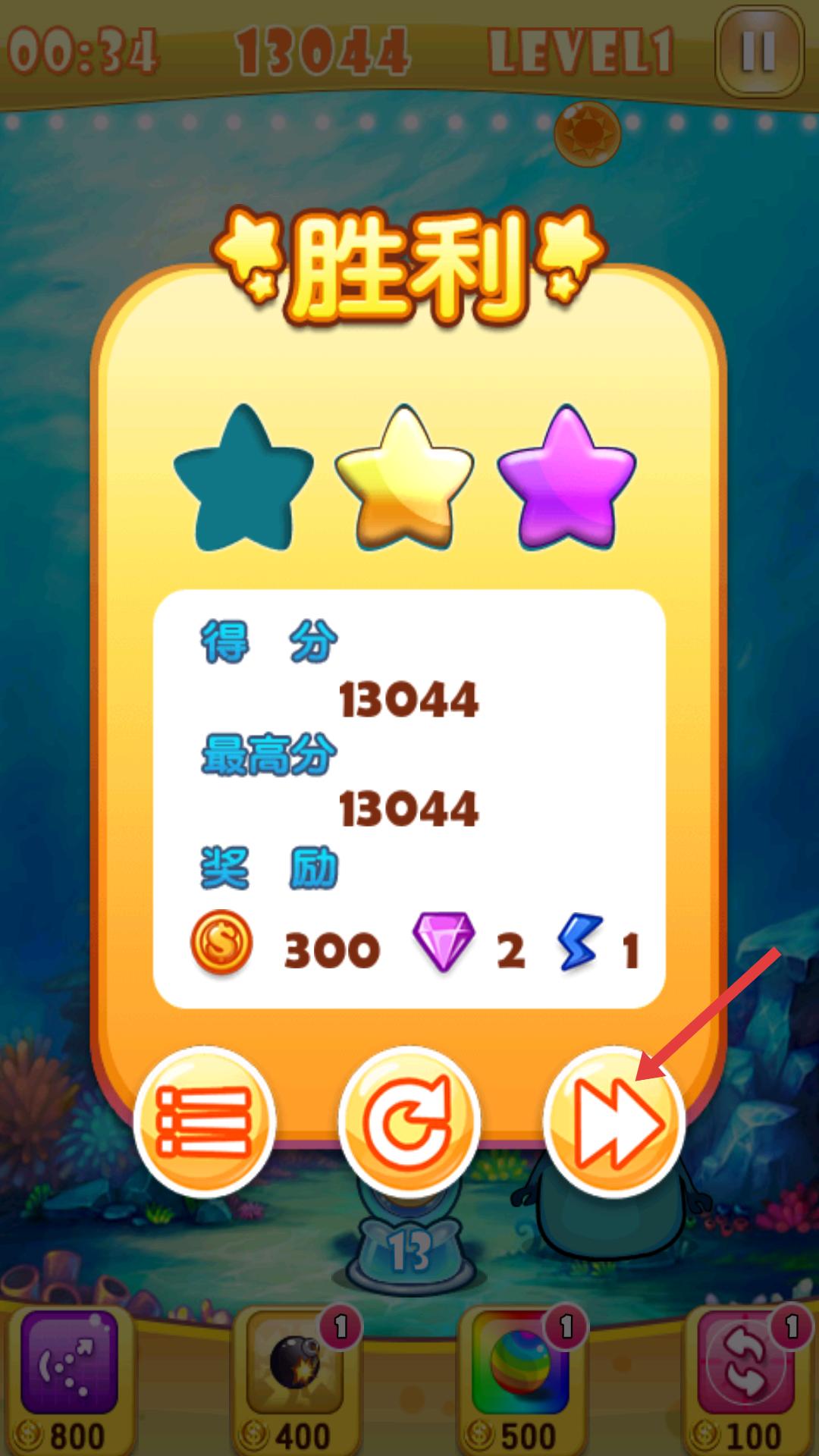 4、成功通關后,界面顯示勝利,可查看得分、最高分和獎勵,點擊右側箭頭按鈕,能進入下一關,繼續游戲挑戰。