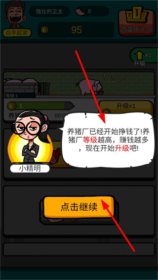 3、養豬廠開始掙錢,了解等級越高賺錢越多,點擊繼續,推進產業穩步向前發展。