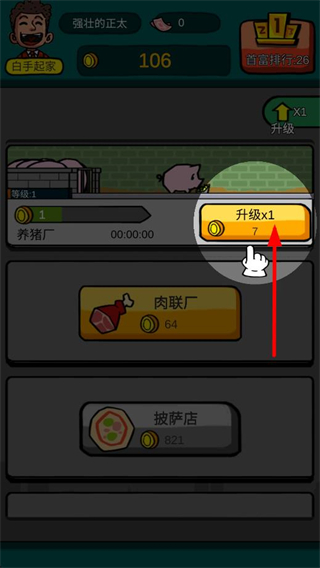 4、升級養豬廠,點擊升級x1按鈕,提升養豬廠等級,增加財富收益,繼續積累財富。