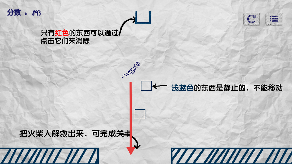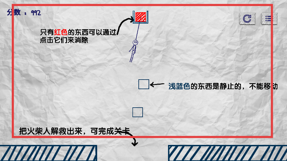 2、在第一關里會給玩家指引教程,只有紅色的東西可以通過,我們需要點擊紅色的物體來消除,淺藍色的東西是靜止的不能移動,要想辦法把火柴人解救出來。
