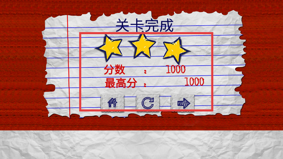 4、成功解救火柴人后就完成關卡,會看到關卡完成界面,能看到分數和最高分,還可以選擇返回關卡選擇、重新挑戰或進入下一關。