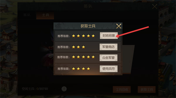 1、可通過封地招募等方式獲取士兵,不同招募方式有不同推薦指數,獲取士兵擴充部隊,為戰斗做準備。