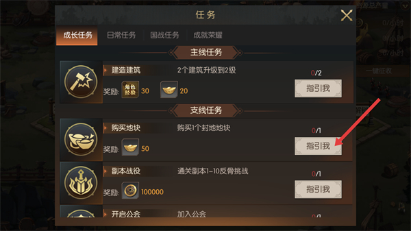 2、查看成長任務、日常任務等,點擊指引我完成建造建筑、購買封地地塊等任務,獲取獎勵,推進游戲進程。