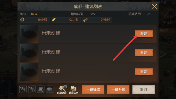 3、在建筑列表里點擊新建,可創建建筑,規劃封地建筑布局,發展封地,提升資源產出和部隊實力。