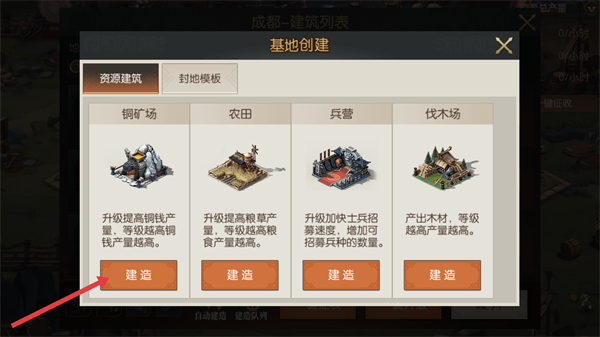 4、可建造銅礦場、農田等資源建筑,不同建筑有不同功能,建造后升級可提高資源產量或招兵效率,助力封地發展。