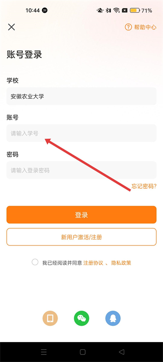 2、賬號登錄界面,輸入學號和密碼,勾選同意相關協議后點擊登錄,也可選擇手機、微信、QQ等方式登錄。