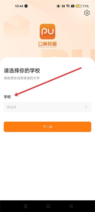 1、打開口袋校園APP,首先選擇就讀的學校,選擇后點擊下一步,進入賬號登錄流程。