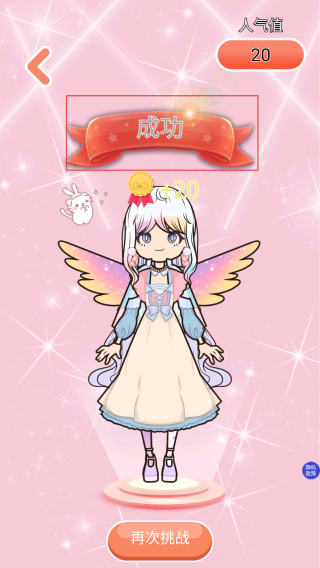 4、提交后查看人氣值結果顯示成功,則獲得相應獎勵,若想追求更高的人氣值,點擊再次挑戰按鈕,重新進行裝扮。