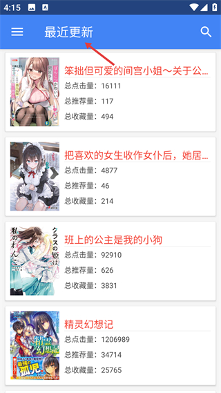 1、進入最近更新頁面,可查看多部作品展示,各作品附帶總點擊量總推薦量總收藏量等數據,選擇感興趣的作品即可進入其詳情頁面。