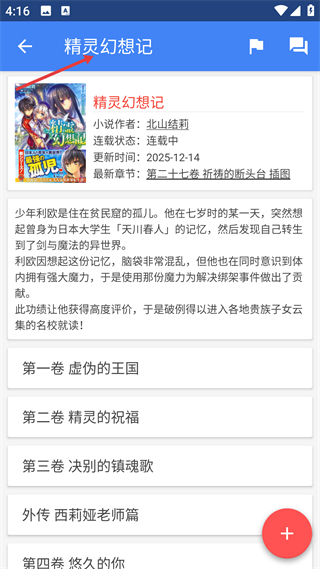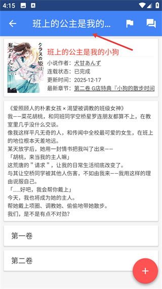 2、點擊作品進入詳情頁,能查看作品的作者連載狀態更新時間等信息,閱讀簡介了解內容設定,同時可選擇對應的卷數進行查看。