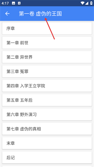 4、點擊作品的對應卷數,進入該卷的章節列表頁面,可看到序章及各章節選項,點擊相應選項即可開始閱讀對應的章節內容。