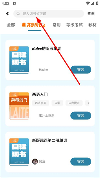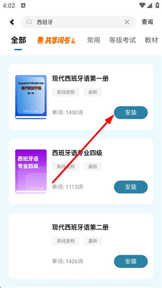 3、搜索框輸入西班牙后,會呈現現代西班牙語第一冊等相關詞書,每本詞書標注單詞數量,旁設安裝按鈕,可獲取對應單詞學習資源。