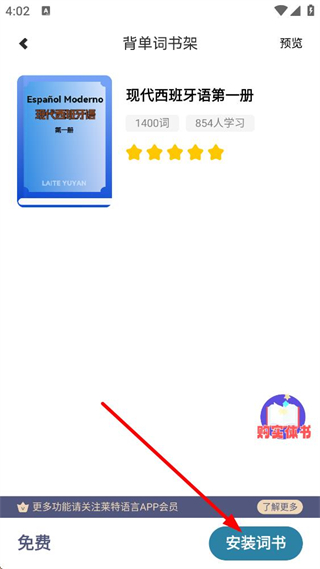 4、安裝詞書后進入背單詞書架界面,能查看已選詞書的信息,包括單詞量與學習人數,還可點擊安裝詞書添加更多資源,豐富學習內容。