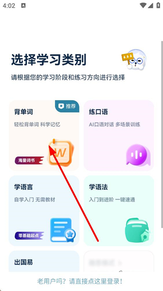 1、進入選擇學習類別界面,能看到背單詞練口語等選項,背單詞功能主打輕松背單詞科學記憶,還標注推薦標識,可依據自身需求選定學習方向。