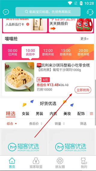 3、登錄后進入首頁找到喵喵搶板塊中的凱利來沙琪瑪商品,點擊立即搶購,進入該商品詳情頁面。