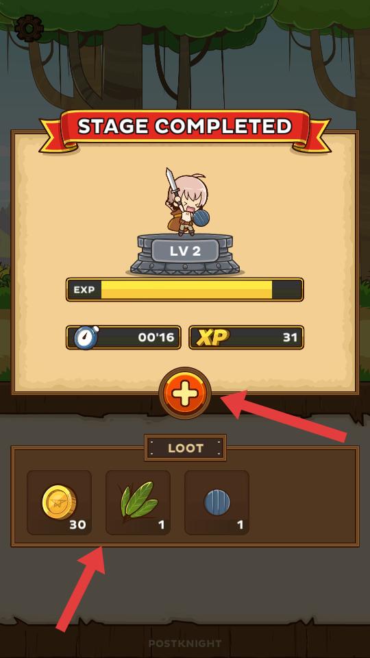 3、戰斗結束后,進入STAGE COMPLETED界面,查看獲得的金幣、樹葉等戰利品,點擊加號按鈕,進行獎勵領取。