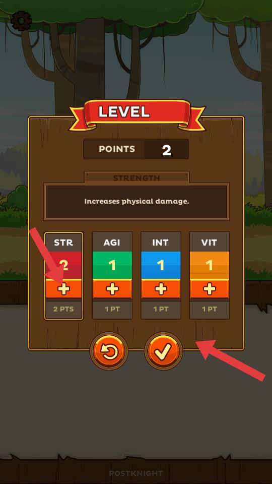 4、升級后進入屬性分配界面,點擊【STR】等屬性旁加號分配點數,確認后點擊對勾按鈕,保存屬性加點。