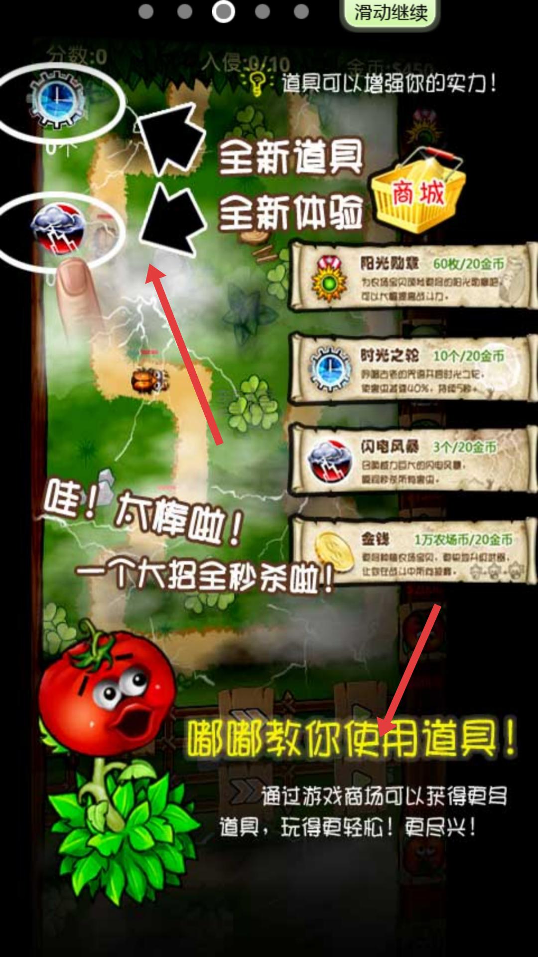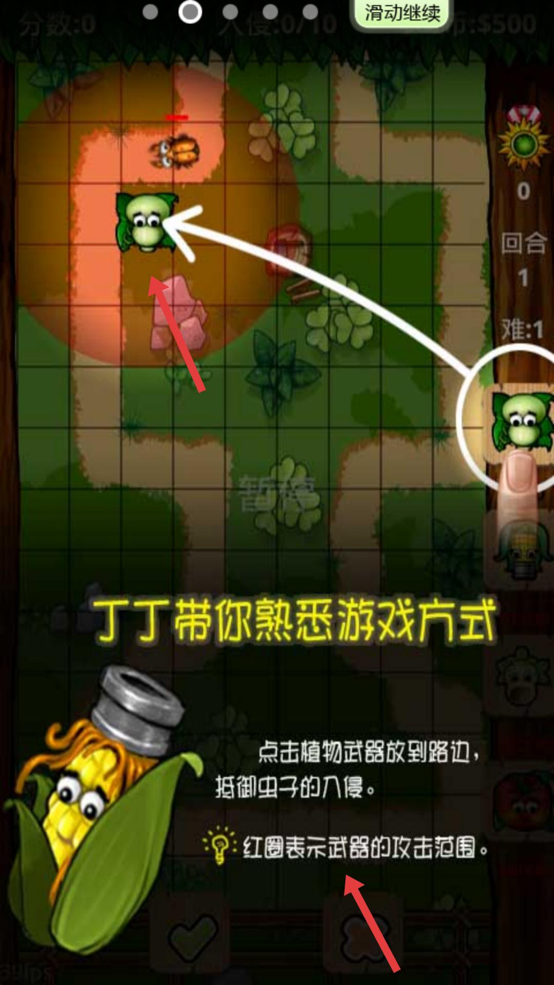 2、進入游戲后,按照提示點擊植物武器,將其放置到路邊,紅圈顯示武器攻擊范圍,利用植物武器抵御蟲子入侵,熟悉游戲防御操作方式。