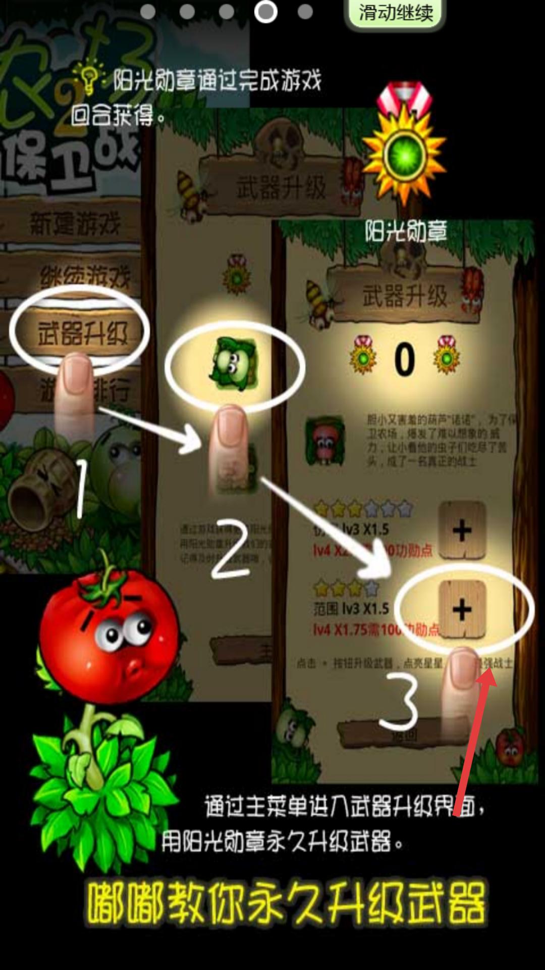 4、完成游戲回合可獲得陽光勛章,通過主菜單進入武器升級界面,使用陽光勛章能永久升級武器,提升武器的攻擊、范圍等屬性,增強農場防御能力。