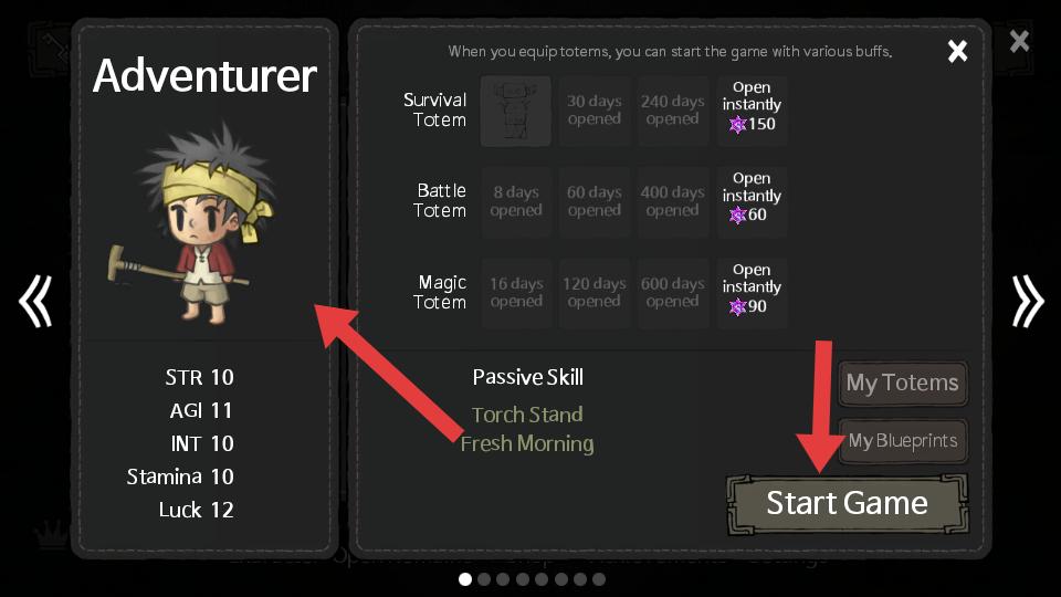 3、查看角色【Adventurer】屬性及圖騰等信息,點擊【Start Game】開始冒險。