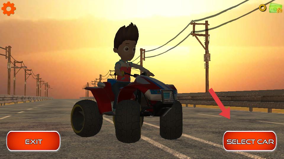 1、進入游戲,能看到駕駛四輪車的畫面,界面有EXIT和SELECT CAR按鈕,點擊SELECT CAR可選擇車輛,開啟賽車準備。
