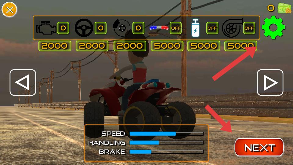 2、在車輛設置界面,能看到發動機,方向盤等部件的升級選項,還有速度,操控,剎車等屬性條,調整好后點擊NEXT進入下一步。