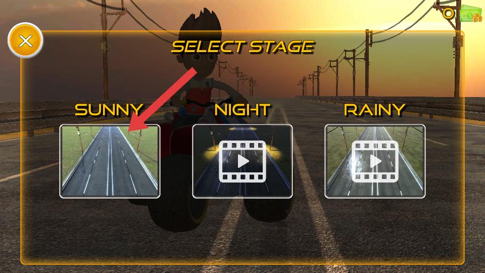 4、進入場景選擇界面,有SUNNY,NIGHT,RAINY等不同天氣場景,選擇SUNNY場景,就能在晴朗天氣的賽道上開始賽車。