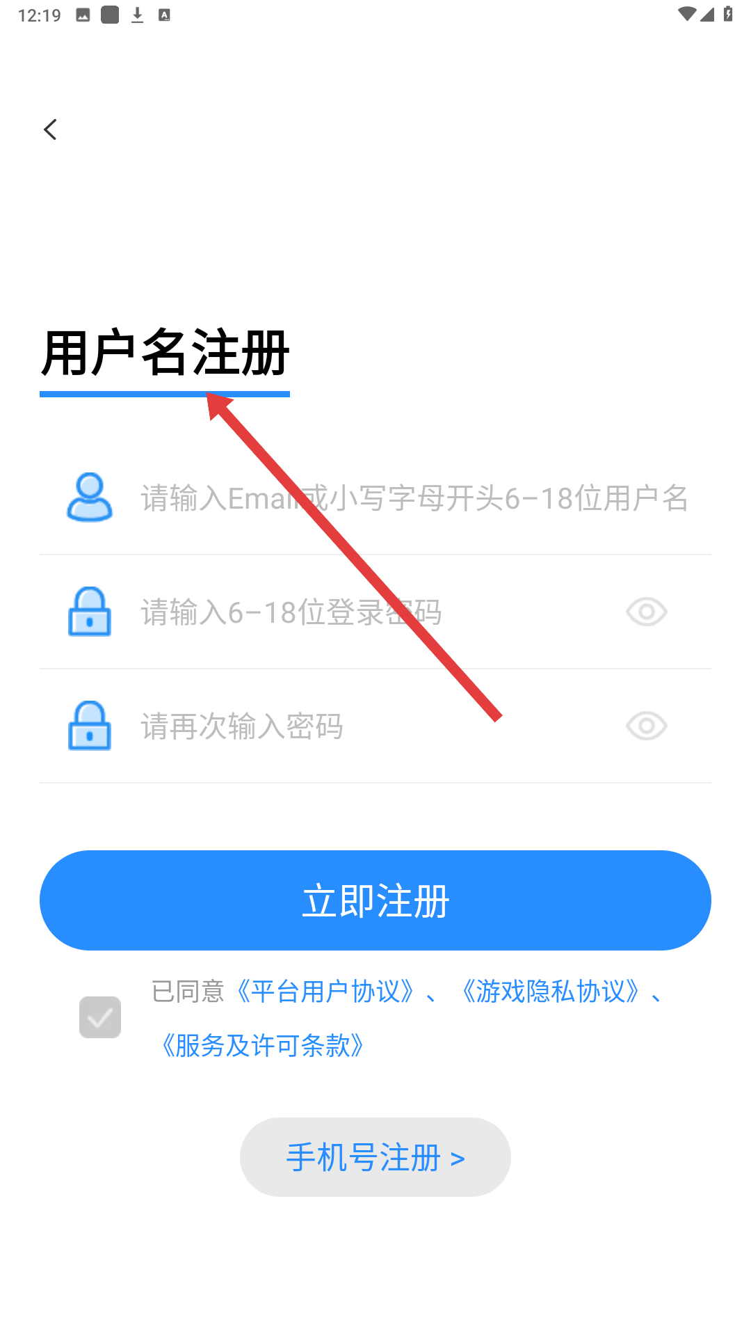 3、登錄界面,可選擇手機驗證碼登錄,也可點擊用戶名注冊,進入用戶名注冊界面后輸入用戶名、密碼等信息完成注冊。