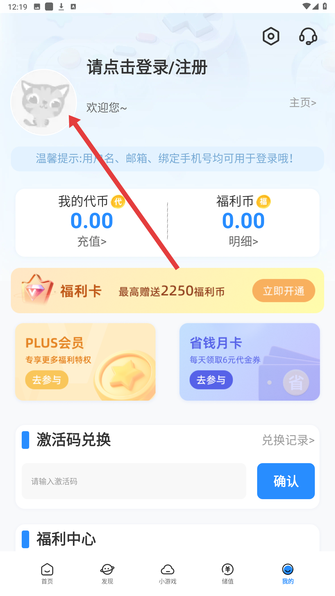 2、點擊我的板塊,進入個人中心,可看到登錄、注冊提示,還有我的代幣、福利幣等信息,可進行激活碼兌換和參與福利活動。