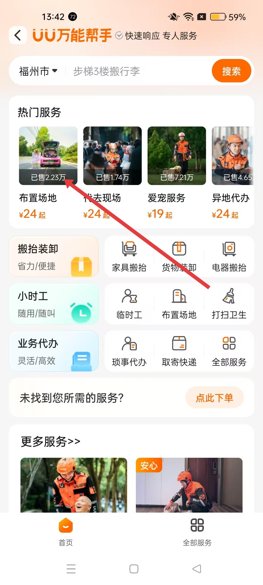 2、萬能幫手服務頁面,可看到熱門服務如布置場地、代去現場等,點擊布置場地可進入其服務介紹頁面。
