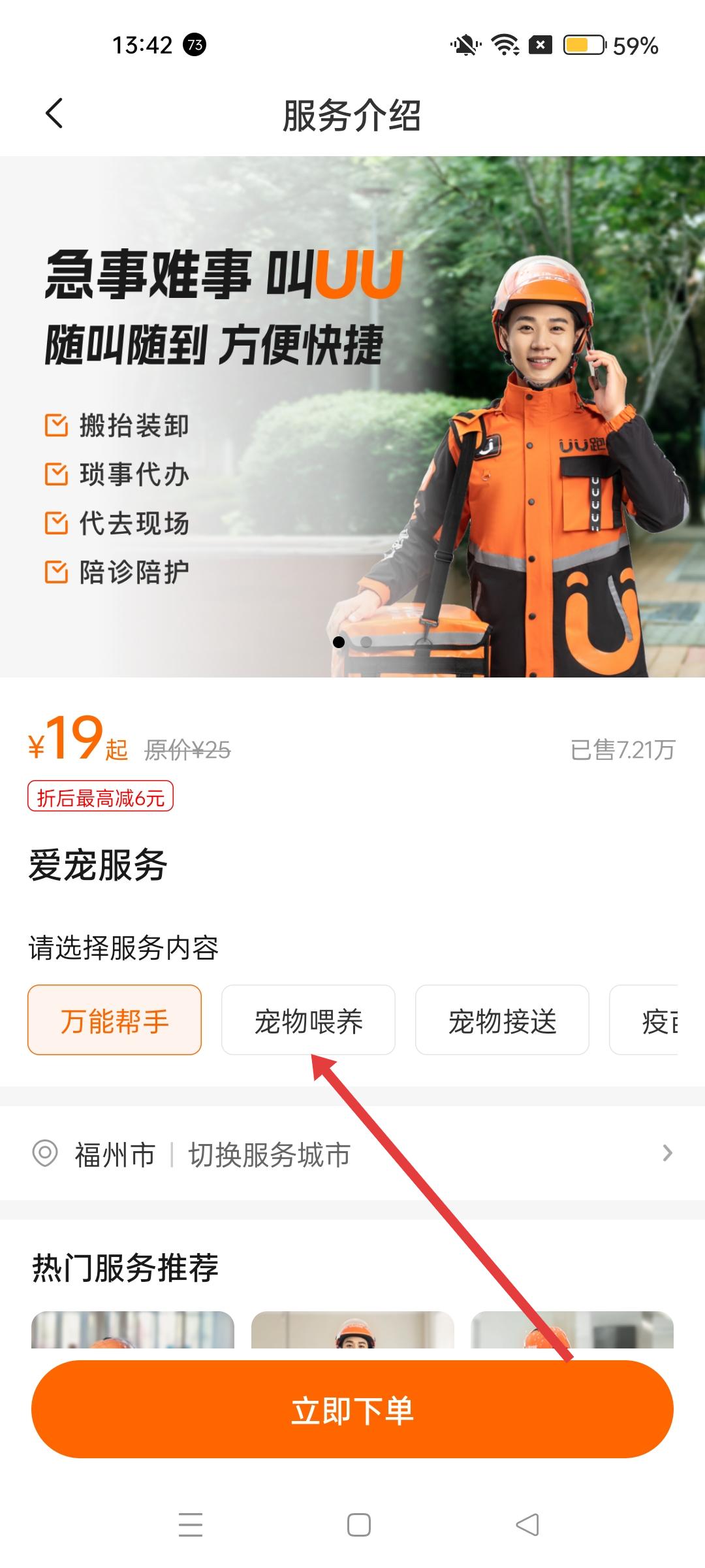 4、此外,還有愛寵服務等其他服務類型,如寵物喂養、寵物接送等,選擇相應服務內容后點擊立即下單可完成服務預訂。