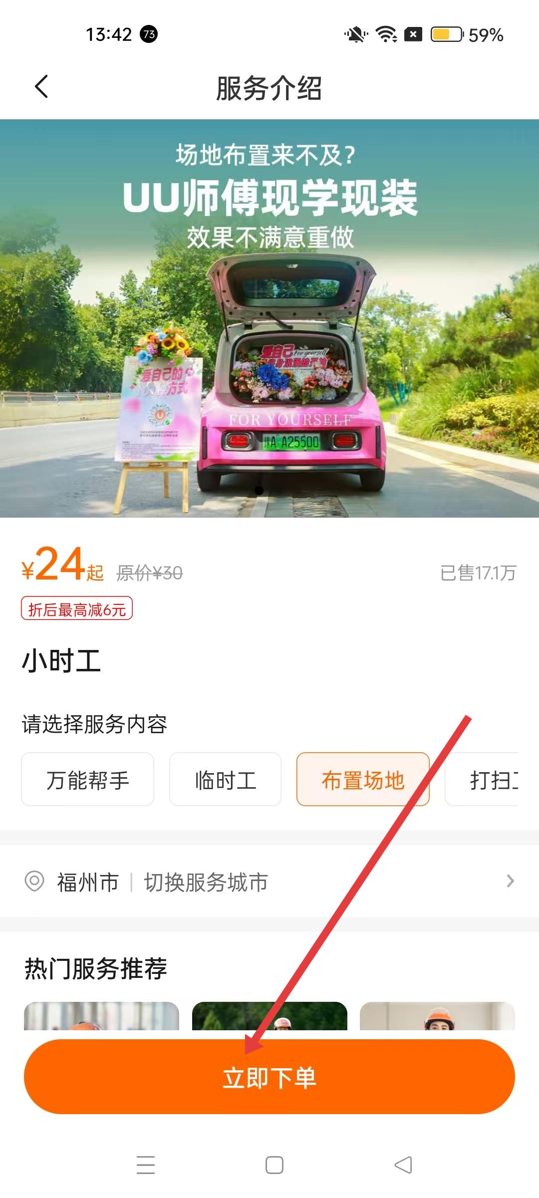 3、布置場地服務介紹頁面,可查看服務價格、已售數量等信息,選擇服務內容后點擊立即下單即可。