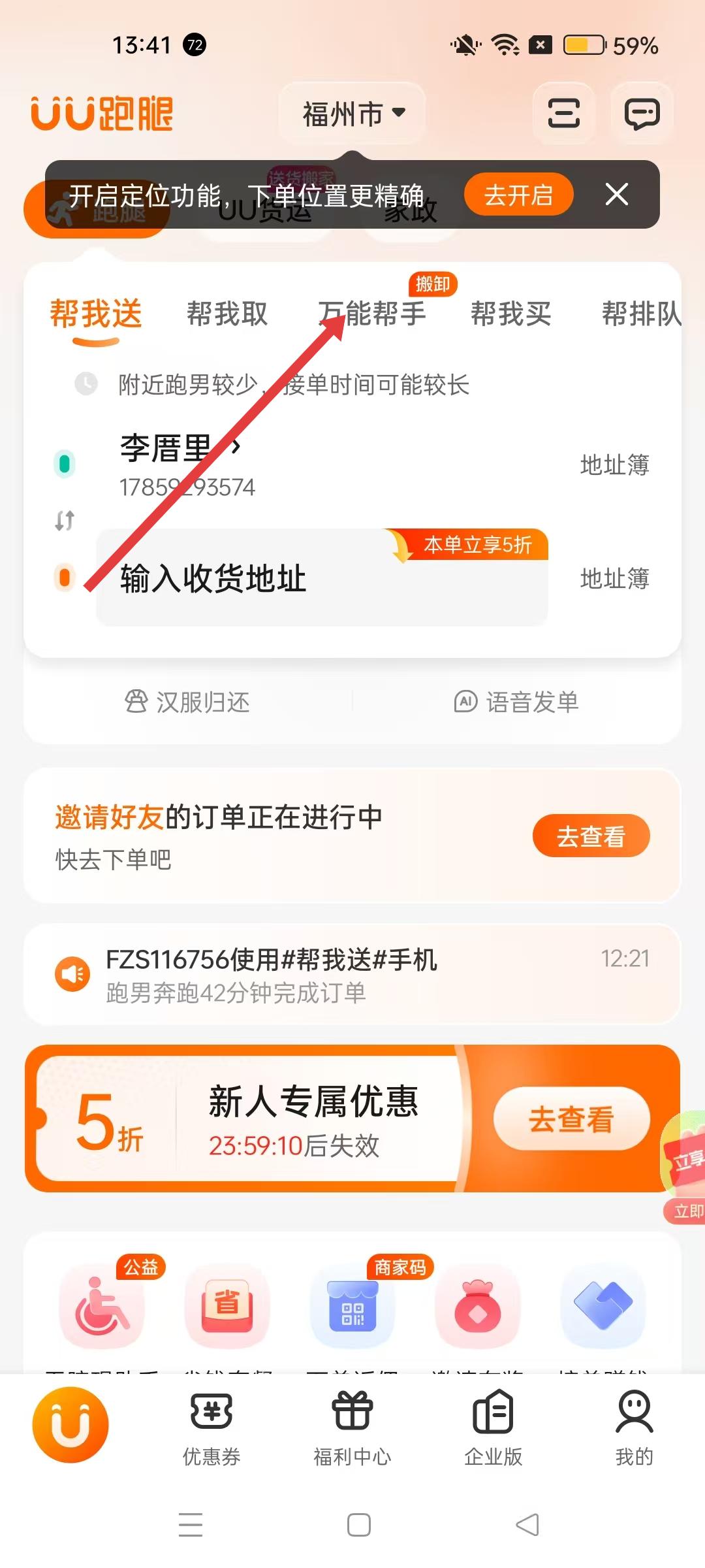 1、進入UU跑腿首頁,點擊萬能幫手選項,可進入萬能幫手服務頁面,該頁面提供多種生活服務選項。