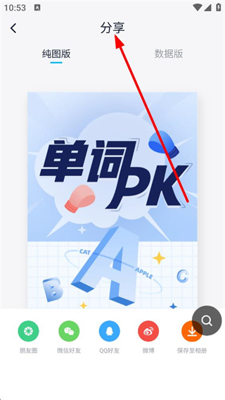 3、點擊底部翻譯選項進入翻譯頁面,即可進入答題環節,完成PK后可進入分享頁面,選擇純圖版或數據版,通過多種渠道分享該功能給他人。