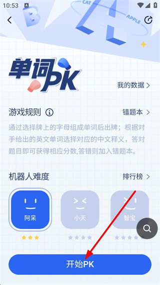 2、單詞PK頁面選擇難度后點擊開始PK,這里可選擇機器人難度,通過組單詞、選釋義的方式答題,答對得分答錯入錯題本。