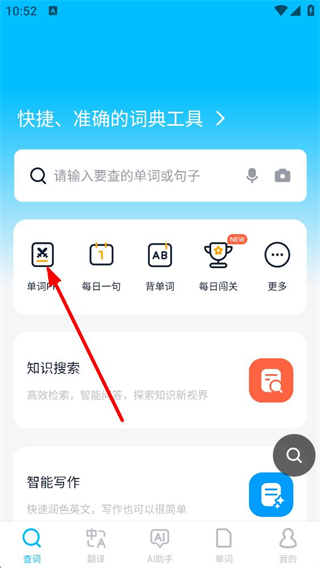 1、金山詞霸首頁,點擊單詞PK選項進入對應頁面,這里支持自動識別語種轉中文,還可選擇語音、圖片、文檔翻譯等方式,滿足不同場景的翻譯需求。