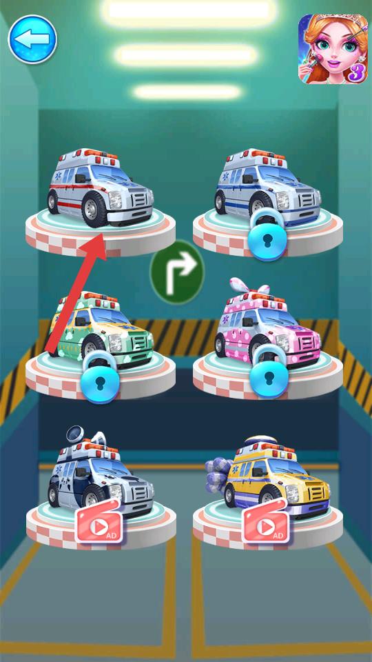 3、在救護車選擇界面,有不同樣式的救護車,部分救護車帶鎖,選擇可使用的救護車,準備出發救治病人。