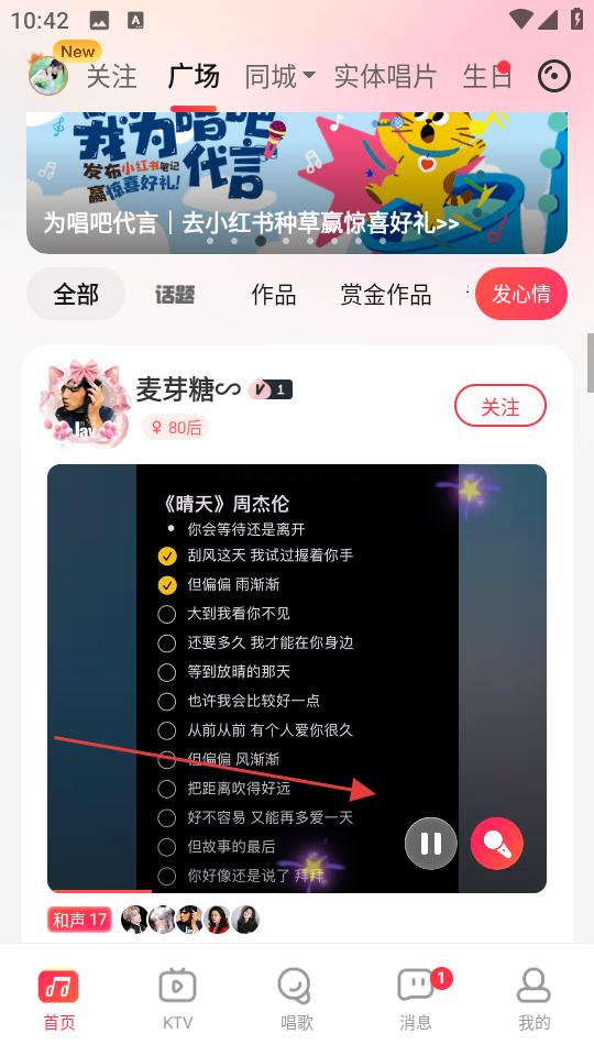 3、演唱完成后,進入廣場頁面,瀏覽其他用戶發布的作品,如麥芽糖發布的晴天歌詞分享,可點擊關注作者,或參與作品互動,完成互動流程。