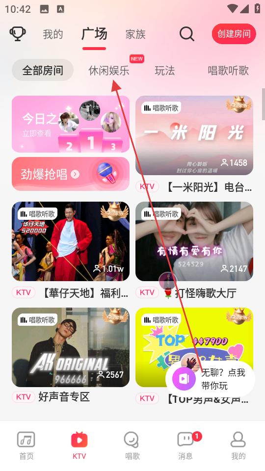 1、打開唱吧APP,進入KTV廣場界面,點擊休閑娛樂分類,瀏覽該分類下的房間,如各類唱歌聽歌主題房間,選擇感興趣房間進入。