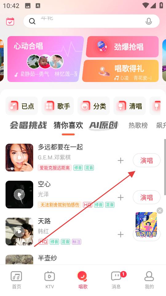 2、切換至唱歌頁面,在猜你喜歡等歌單里,找到想演唱的歌曲如多遠都要在一起,點擊演唱按鈕,進入歌曲演唱準備界面。