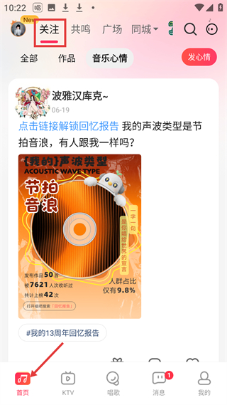 1、首頁關注欄展示用戶波雅漢庫克的內容,其聲波類型為節拍音浪,可點擊鏈接解鎖回憶報告還能發心情互動。