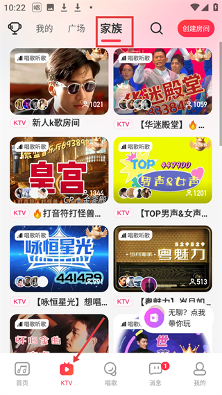2、KTV頁面家族欄,有新人k歌房間華迷殿堂等多個唱歌房間,匯聚眾多愛好者,支持創建房間一同歡唱。