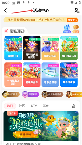 3、活動中心頁面有隨便釣釣、福利.社典藏版獎勵等常駐活動,還有奇妙生物果核危機等熱門活動吸引用戶參與。