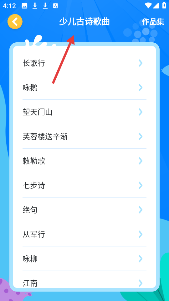 3、少兒古詩歌曲頁面,涵蓋長歌行等經典古詩,為少兒提供豐富的古詩學習資源感受傳統文化魅力。