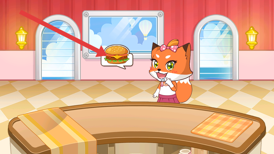 2、進入溫馨的店內場景,俏皮的狐貍角色身旁彈出漢堡樣式的氣泡,這是顧客發出的需求信號,要留意氣泡里漢堡的樣子,準備好為顧客制作對應的美味漢堡。